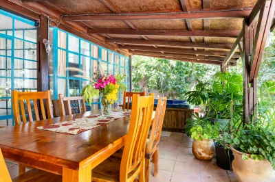 החצר שלנו מתהדרת במרפסת עץ מקסימה, עם ג'קוזי מפואר ופינת אוכל אלפרסקו. בנוסף, החצר מספקת חללי ישיבה טבעיים מושלמים למנוחה או למשחק בין העצים. עם אזור ברביקיו ומדורה ייעודי, הסביבה החיצונית יוצרת אווירה פסטורלית באמת לאורחים שלנו.